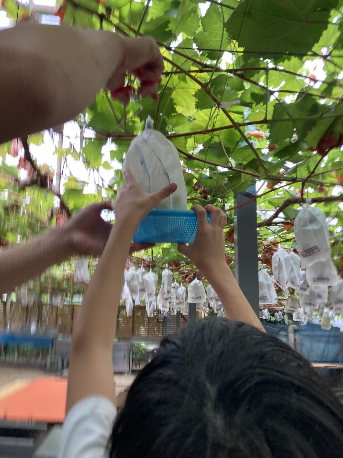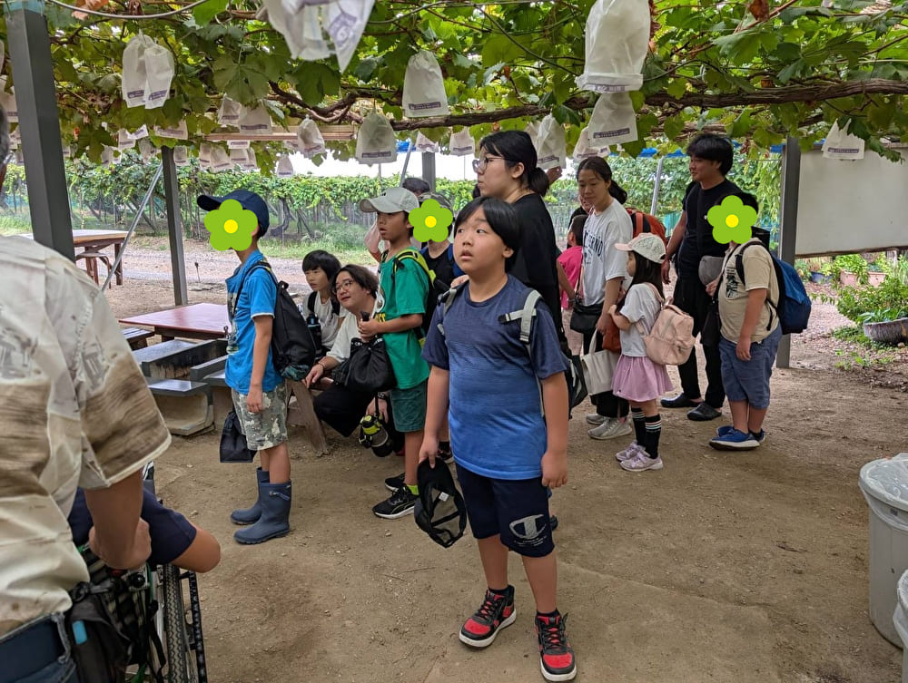 みんなで、係の人の説明を聞いていざ!ブドウ狩りへ!!