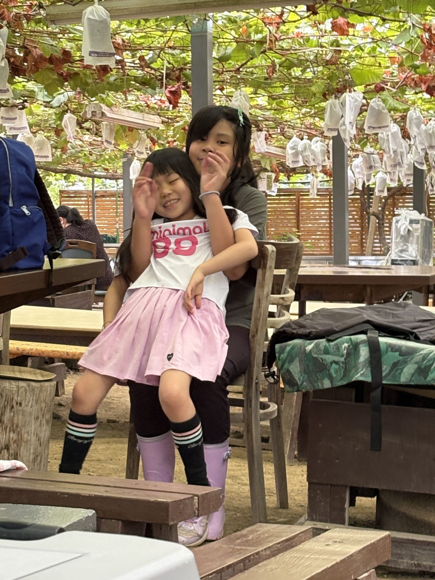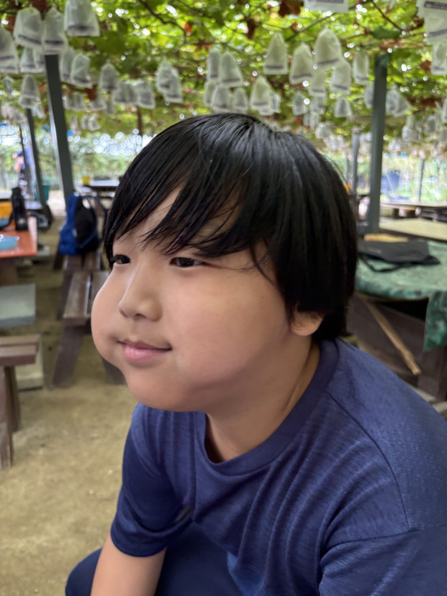 お昼過ぎたら農園を探検しに行くと、わんちゃんがいてみんな鳴き声を真似していたり、いろんな果物の木をみたり