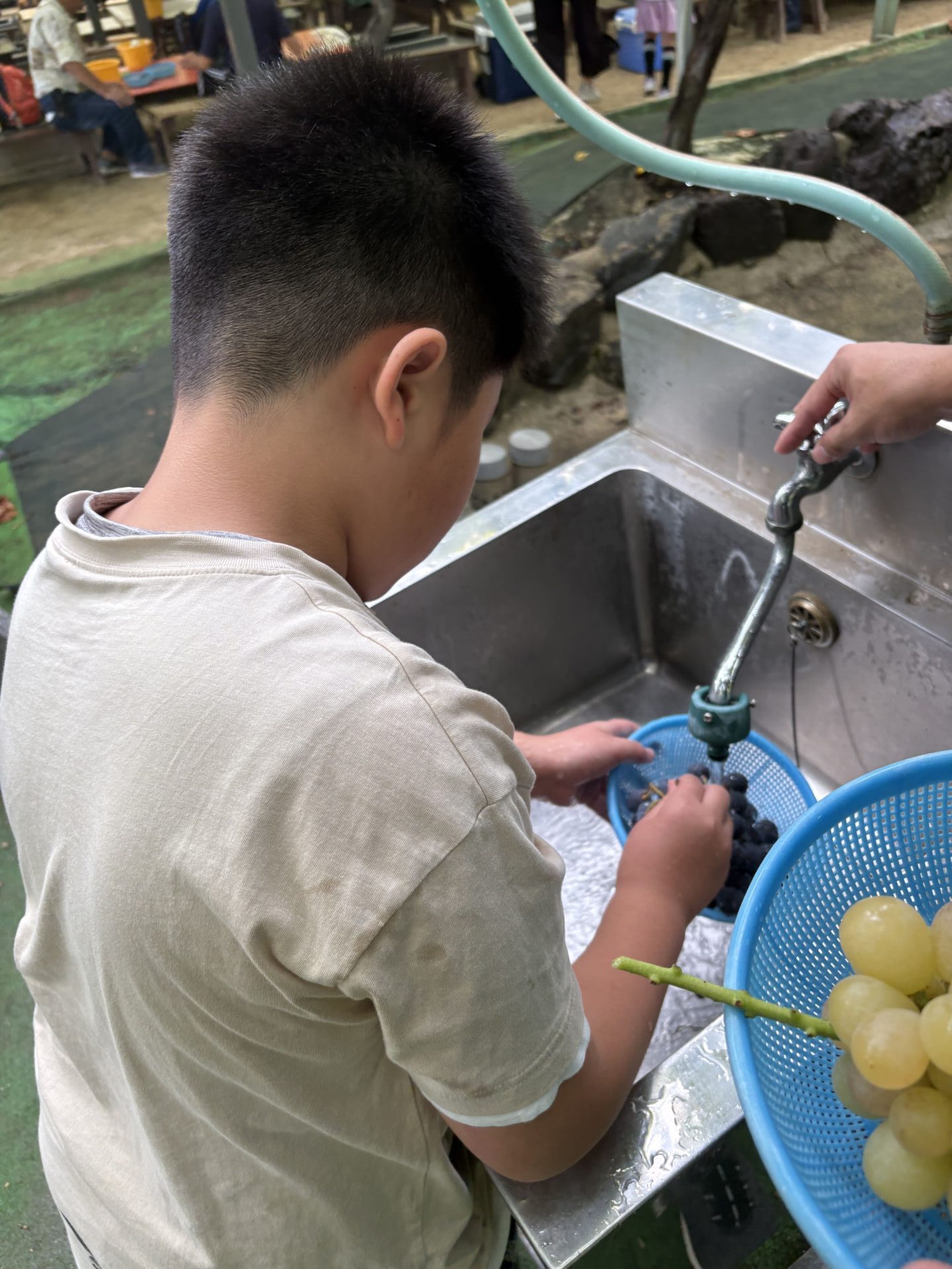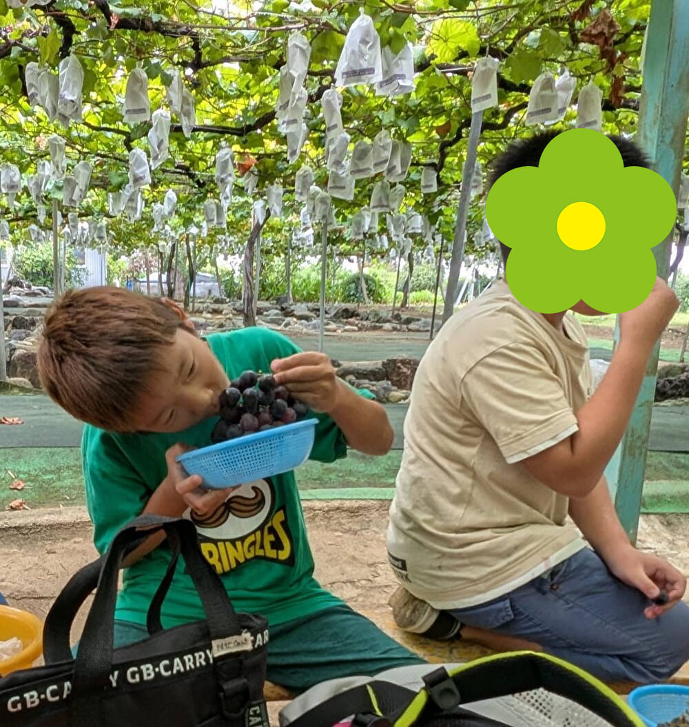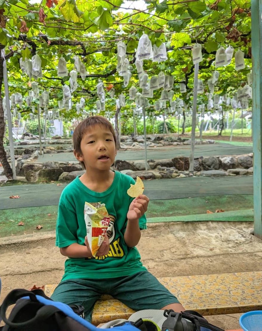 お菓子とブドウを交互に食べる子やお菓子を先に食べまた新しいブドウを取って食べていました
